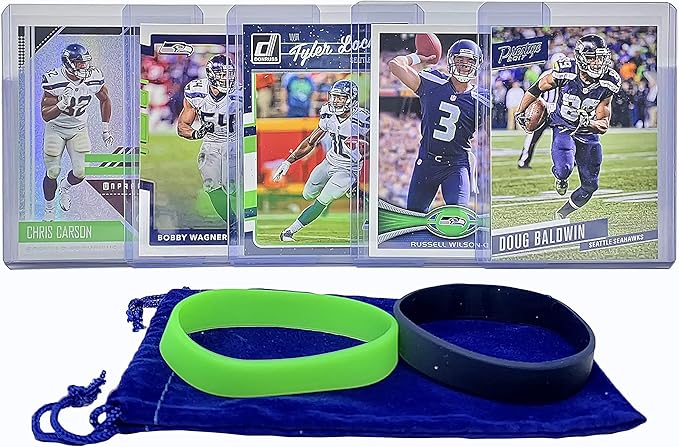 Amazon Com Seattle Seahawks Cards Russell Wilson Chris Carson Doug Baldwin Tyler Lockett Bobby Wagner Assorted Football Trading Card And Wristbands Bundle Sports Collectibles