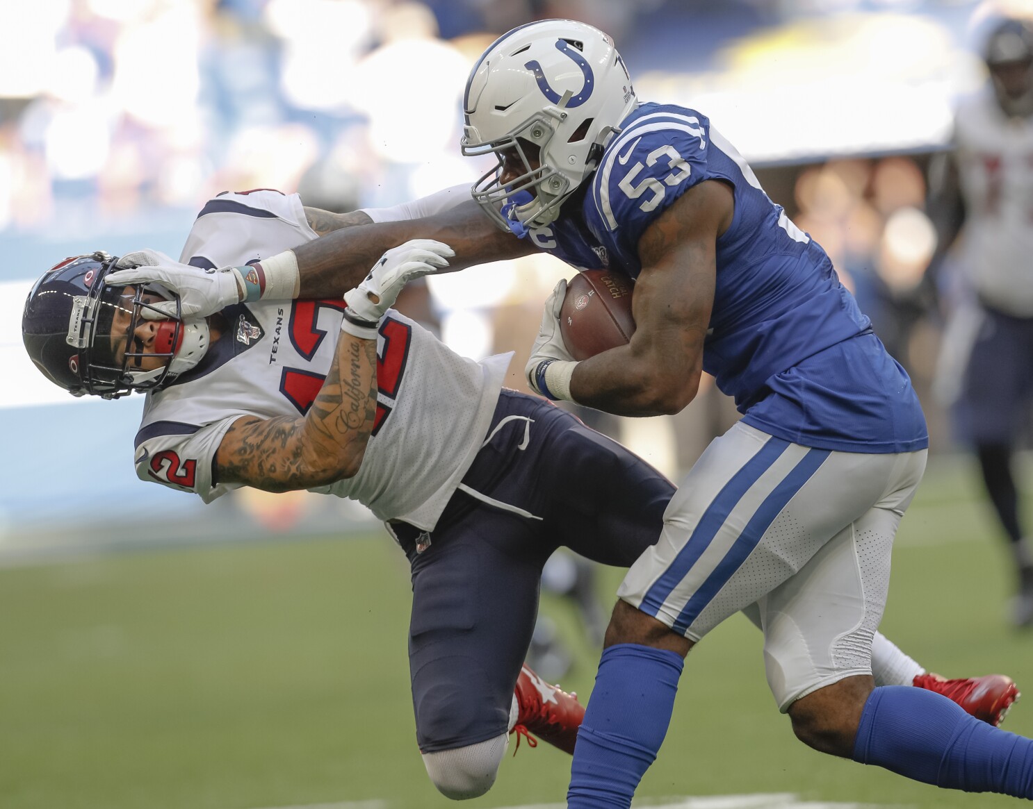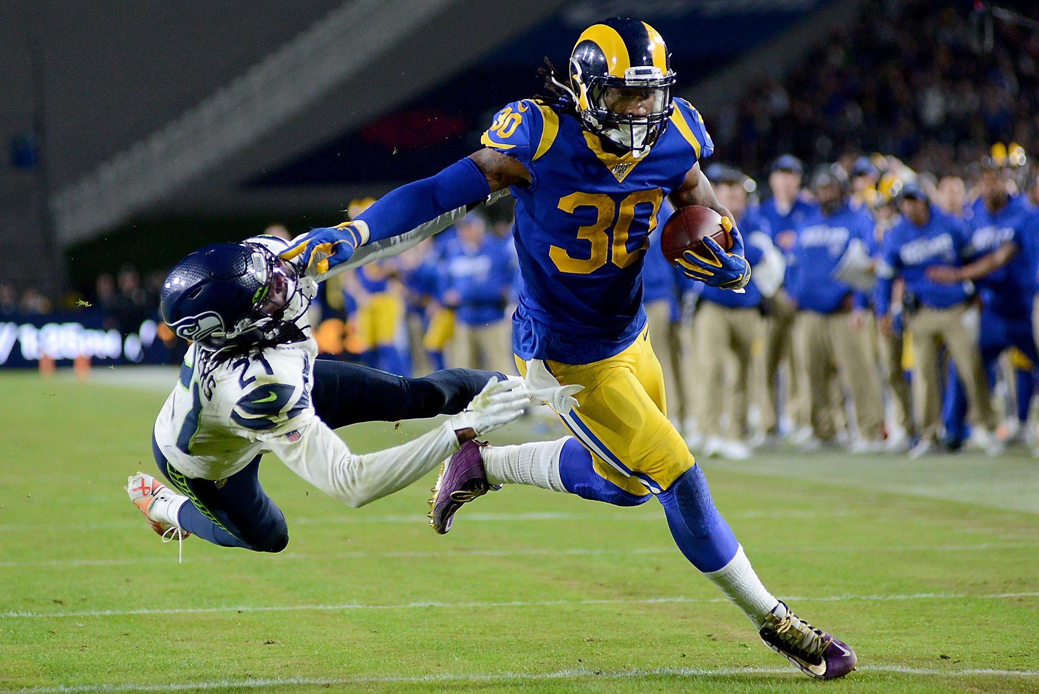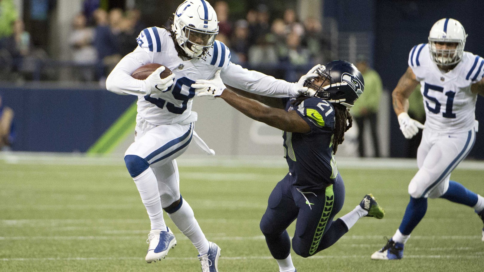 Chris carson of the seattle seahawks stiff arms ross cockrell of the carolina panthers in the fourth quarter during their game at bank of america stadium on december 15 2019 in charlotte north. That was after his backup cj. Marshawn lynch stiff arms db off with 20 yard gain.